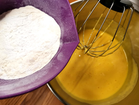 Separiamo i tuorli dagli albumi ed aggiungiamoli, uno alla volta, all'impasto, continuando a mescolare con le fruste tra un'aggiunta e la successiva.
